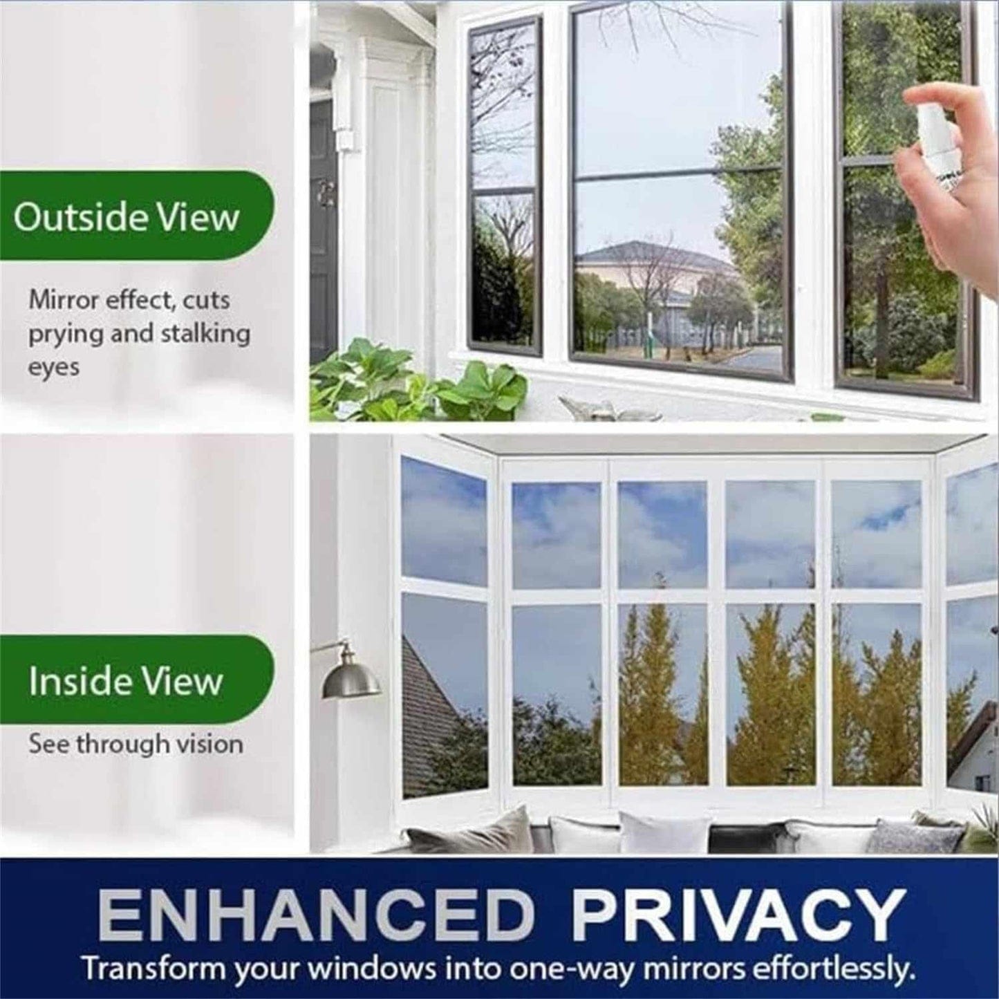 Turn any glass into a one-way mirror in just 5 minutes with Window Spray. You see out 100% clearly, others see nothing inside.